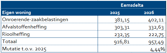 De woonlasten voor een eigen woning stijgen met gemiddeld 4,44% ten opzichte van 2025, voor een gemiddeld huishouden betekent dit een lastenstijging van €40,68.