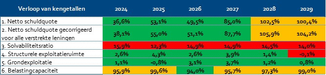 Dit kengetal geeft weer hoe de waarde van de grond zich verhoudt tot de totale (geraamde) baten. Voor de berekening van dit kengetal delen wij de bouwgrond in exploitatie door de totale baten uit de programmabegroting en uitgedrukt in een percentage.