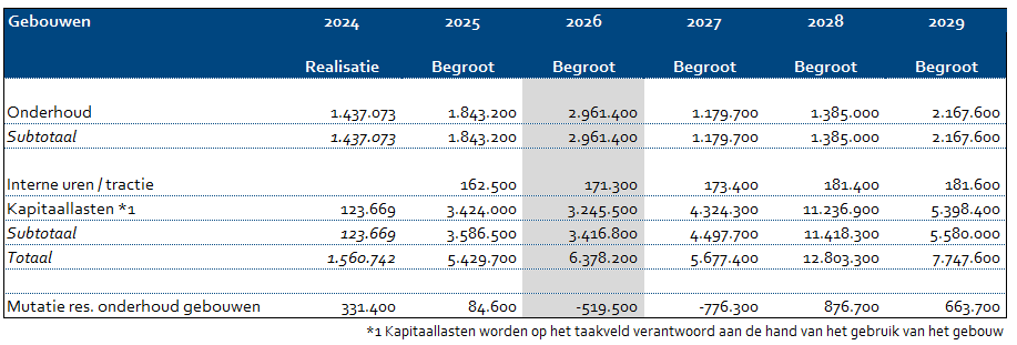 De beschikbare middelen voor het gebouwonderhoud zijn sterk versnipperd door de begroting en zijn vooralsnog niet eenduidig bij elkaar op te tellen. De hierboven gepresenteerde bedragen zijn exclusief onderhoudskosten sport en onderwijs. De onderhoudsmiddelen voor gebouwonderhoud: exploitatielasten en investeringen worden de komende periode verder geharmoniseerd.