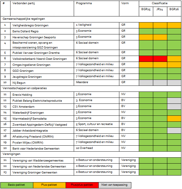- Nij Begun (GR) is nieuw, maar meer een samenwerkingsvorm dan een verbonden partij en wordt daarom niet beoordeeld. De GR is een samenwerking en richt zich op overleg en advisering aan de raden en staten over besluitvormingsprocessen die voortkomen uit de implementatie en uitvoering van Nij Begun en waar opportuun in samenhang met parallelle processen vanuit het Nationaal Programma Groningen.