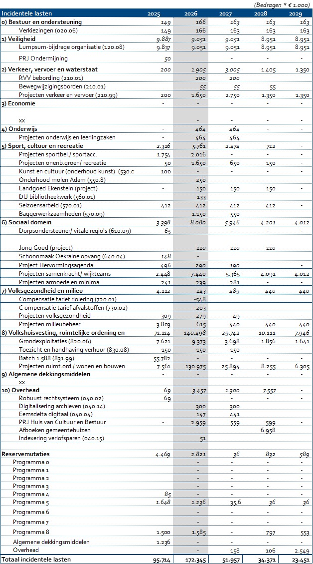 Voor het begrijpen van de financiële situatie van onze gemeente is het maken van onderscheid tussen structurele en incidentele posten essentieel. Over het algemeen voeren we structurele taken uit met bijbehorende structurele kosten die in de begroting worden opgenomen. Structurele kosten vormen de norm, terwijl incidentele kosten uitzonderlijk zijn. Incidentele inkomsten en uitgaven zijn die posten die een eenmalige invloed hebben op het begrotingssaldo. In het bijgevoegde schema zijn de geschatte incidentele kosten en opbrengsten van aanzienlijke grootte per programma gesaldeerd weergegeven.