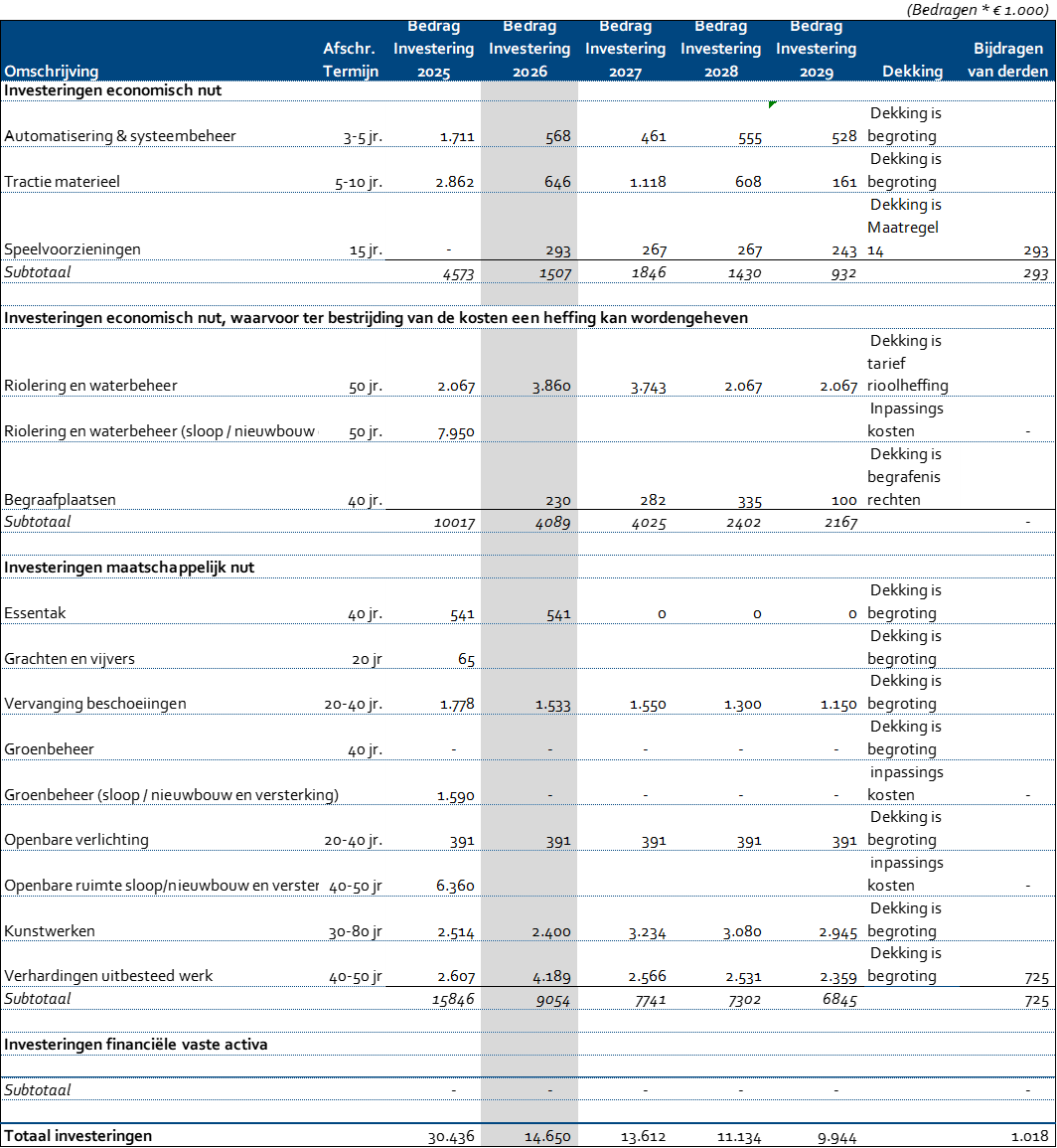De in de kolom voor 2026 getoonde investeringen betreffen de investeringskredieten die voor het jaar 2026 door u beschikbaar zijn gesteld.