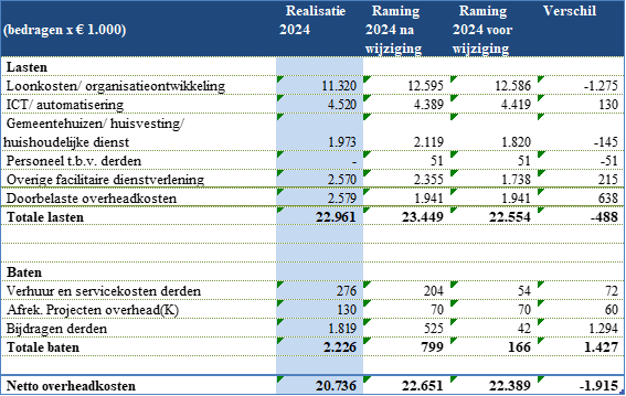 Het Besluit Begroting en Verantwoording (BBV) schrijft voor dat we de baten en lasten van de overhead in een apart overzicht moeten opnemen. In de programma's nemen we de kosten op die betrekking hebben op het primaire proces.
