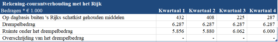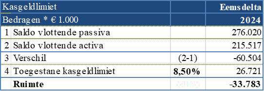 De norm voor de kasgeldlimiet is 8,5% van het begrotingstotaal. In onderstaande tabel is de benutting van de kasgeldlimiet over 2024 weergegeven:
