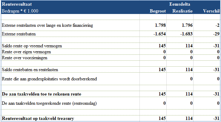 De gemeente Eemsdelta heeft geen renteherzieningen, aangezien alle leningen een vast rentepercentage hebben voor de gehele looptijd. In 2024 is er in totaal € 6,4 miljoen aan leningen afgelost. De renterisiconorm bedroeg € 62,9 miljoen, wat resulteert in een onderschrijding van € 56,5 miljoen. Onze financiering in 2024 bleef ruim binnen de renterisiconorm, wat in lijn is met onze verwachtingen bij de begroting. Dit betekent ook dat er geen aanvullende maatregelen nodig zijn op grond van de Wet FIDO.