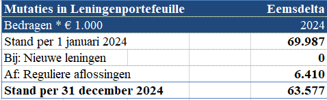 Hieronder is een overzicht opgenomen van de leningen ultimo 2024. Ten behoeve van de financieringsbehoefte zijn er in 2024 geen nieuwe langlopende leningen afgesloten.